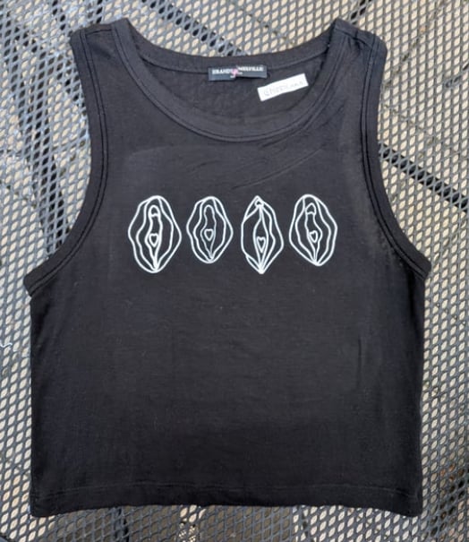 Airy, thin material and stretchy black crop top with four white vulva prints.